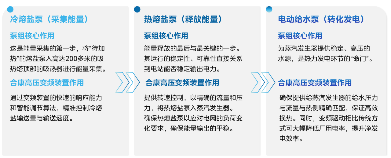 在这一复杂的光热发电系统中,合康新能高压变频装置承担着对关键设备的核心调控重任,通过强大可靠的变频技术将这三大关键泵组串联起来实现高效稳定运转,构建了从能量采集储存、释放到电能转换的完整能量流:
